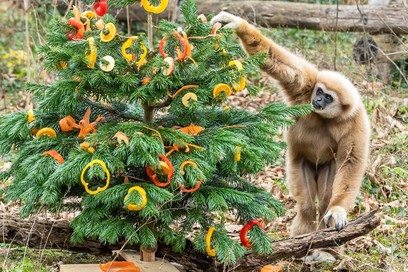 Auch wenn die Zoobesucher zu Weihnachten heuer doch ausbleiben, hat die Weißhandgibbon-Familie schon eine vorweihnachtliche Überraschung bekommen: ein Christbaum geschmückt mit den verschiedensten Leckereien. Männchen Rao hat ihn Stück für Stück abgeräumt, um die Bananen, Paprika und Äpfel mit seiner Familie zu teilen. Hier geht's zum Video.