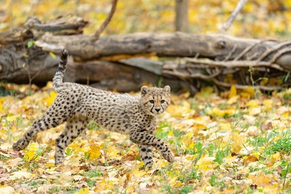 Die fünf Monate alten Geparden-Jungtiere Malkia, Sibaya, Tuli und Paka spielen gerne im Blätter-Teppich auf der Außenanlage. Miteinander raufen ist für sie der größte Spaß. Mutter Afra lässt ihren Nachwuchs nicht aus den Augen. Gar nicht so einfach, wenn vier schnelle Katzen kreuz und quer herumflitzen.