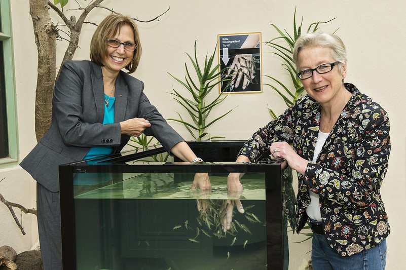 Fische zum Anbeißen. Gleich beim Eingang erwartet die Besucher ein besonderes Aquarium mit Rötlichen Saugbarben. Diese in der Türkei, Syrien und Jordanien heimischen Schwarmfische sind vielen als Knabberfische bekannt. In ihrem Verbreitungsgebiet werden sie bereits seit Jahrhunderten zur Therapie unterschiedlicher Hautprobleme eingesetzt. Mit ihren hornigen Lippen entfernen sie Hautschuppen feiner als jeder Laser. Schratter: „Auch im Wüstenhaus kann man mit diesen Fischen nun auf Tuchfühlung gehen. Ihr Aquarium ist oben offen und man kann seine Hände ins Wasser halten und sich von ihnen anknabbern lassen."