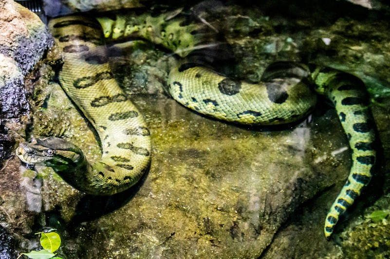 Die Große Anakonda ist die größte "Würgeschlange" der Welt. Weibchen werden größer als Männchen und können eine Länge von über 8 m erreichen. Die Große Anakonda lebt in Regenwaldflüssen und Lagunen. Ihr Vorkommen ist immer an Wasser gebunden. Anakondas sind Lauerjäger, ihr Nahrungsspektrum umfasst alle in ihrem Lebensraum vorkommenden kleinen bis mittelgroßen Wirbeltiere, wie Fische, Amphibien, Reptilien, Vögel und Säugetiere, aber auch Artgenossen.