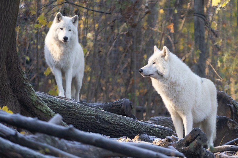 Der Arktische Wolf ist etwas kleiner als andere Wolfsarten, hat weniger spitze Ohren und eine kürzere Schnauze. Er bewohnt die nördlichen Regionen Nord-Amerikas und Grönlands. Sein immer weißes Fell macht ihn fast unsichtbar für seine Beutetiere und schützt ihn vor den eisigen Temperaturen. Er lebt und jagt in Rudeln mit genauer Rangordnung.
