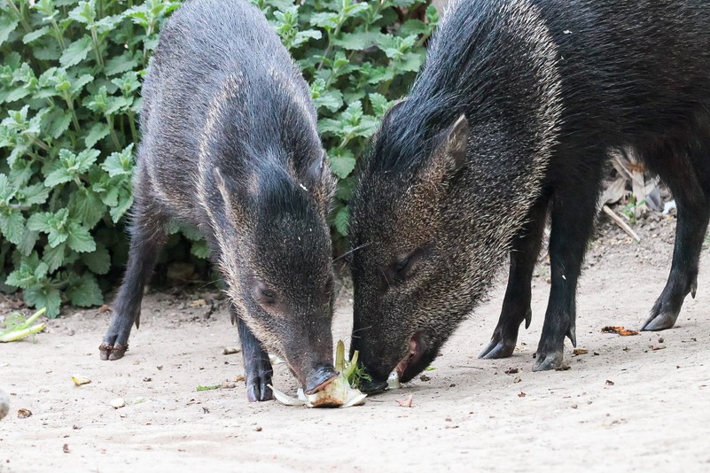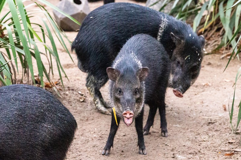 Pekaris haben ein ausgeprägtes Ammensystem. Meist werden Zwillinge geboren, die auch von anderen Weibchen der Gruppe gesäugt und beschützt werden. Stirbt die Mutter, sind die Jungtiere so weiterhin versorgt. Das grauweiße Band um den Hals gibt dieser Tierart ihren Namen.