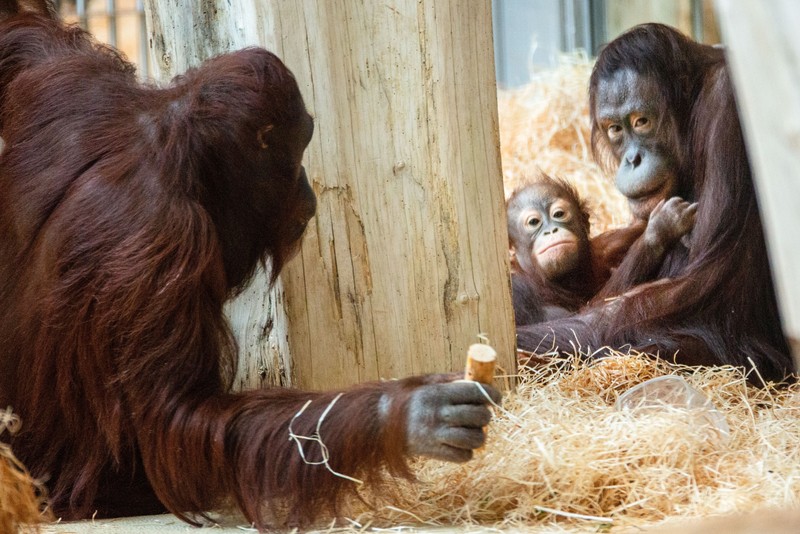 Orang-Utans leben in kleinen Gruppen, bestehend aus Weibchen und ihren Jungtieren. Als Schutz vor Feinden bauen sie sich zum Schlafen Baumnester. Die Männchen sind fast doppelt so groß und haben Backenwülste und mit zunehmendem Alter sehr lange, zottelige Haare, die ihre Drohgebärden unterstreichen.