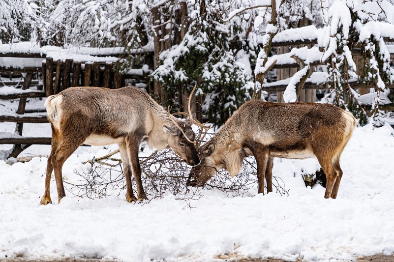 Rentiere leben in den kargen Weiten der arktischen Tundra und Taiga. Vor Kälte schützt sie ihr dichtes Fell. Als weitere Anpassung an ihren Lebensraum fungieren die Hufe der Rentiere als Schneeschuhe: Sie können ihre Klauen weit spreizen, um nicht im tiefen Schnee einzusinken. Im Gegensatz zu allen anderen Hirschen tragen bei den Rentieren auch die Weibchen ein mächtiges Geweih.