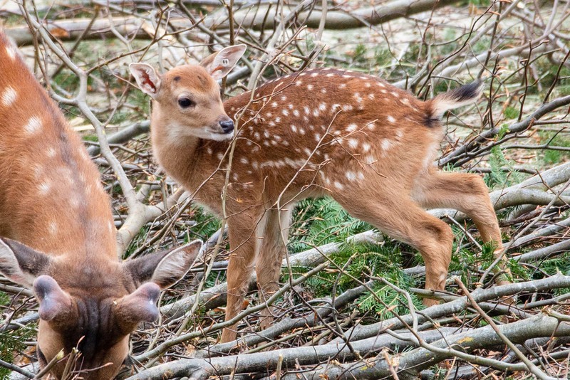 Auffällig ist das Fell der Sikahirsche. Im Gegensatz zu anderen Hirscharten, bei denen nur die Jungtiere gefleckt sind, bleibt diese Zeichnung bei den Sikahirschen ein Leben lang. Das braune Fell mit den weißen Flecken bietet diesen Waldbewohnern eine gute Tarnung. Im Spiel von Licht und Schatten sind sie kaum zu erkennen.