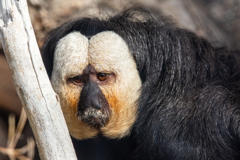 Deutlich ist beim Weißgesichtssaki das Männchen an seiner weißen Gesichtsmakse zu erkennen. Die Weibchen haben ein dunkel gefärbtes Gesicht mit zwei senkrechten hellen Streifen. Mit ihrem zotteligen, langen Fell wirken die Tiere größer als sie tatsächlich sind, erreichen sie doch nur eine Körpergröße von ca. 35-45 cm.