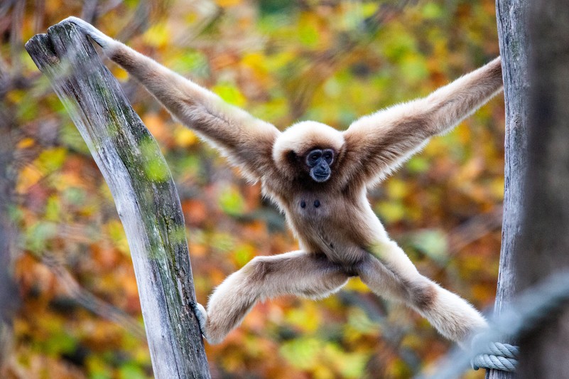 Diese kleinen Menschenaffen sind hoch spezialisierte Hangler und Schwingkletterer, die bis zu 12 m weit durch die Baumkronen „fliegen" können. Aber auch aufrecht auf zwei Beinen bewegen sie sich geschickt und schnell.