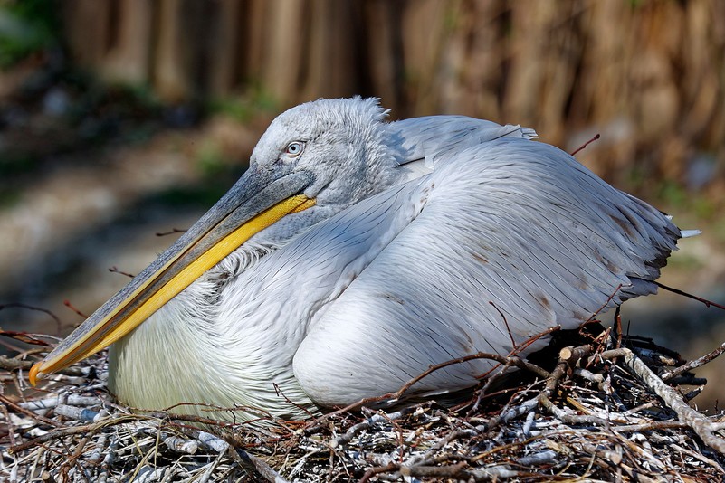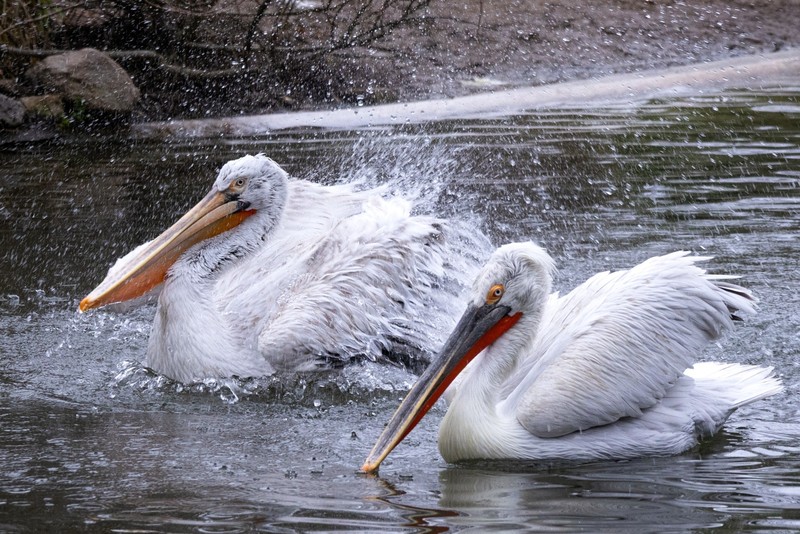 Mit einer Flügelspannweite von rund 3 Metern ist der Krauskopfpelikan der größte Pelikan. Seinen Namen verdankt er den gekräuselten Federn am Kopf. Mit seinem mächtigen Schnabel erbeutet er bis zu 1,5 kg Fisch am Tag. Der stark dehnbare Hautsack am Unterschnabel dient dabei als eine Art „Kescher“, der Oberschnabel bildet den Deckel.
