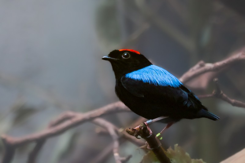Farbenprächtig sind bei dieser Vogelart nur die Männchen. Während Weibchen und Küken schlicht olivgrün sind, tragen die Männchen ein auffallendes Federkleid: Ihr Gefieder ist glänzend schwarz, am Rücken hellblau und der Kopf leuchtend rot.