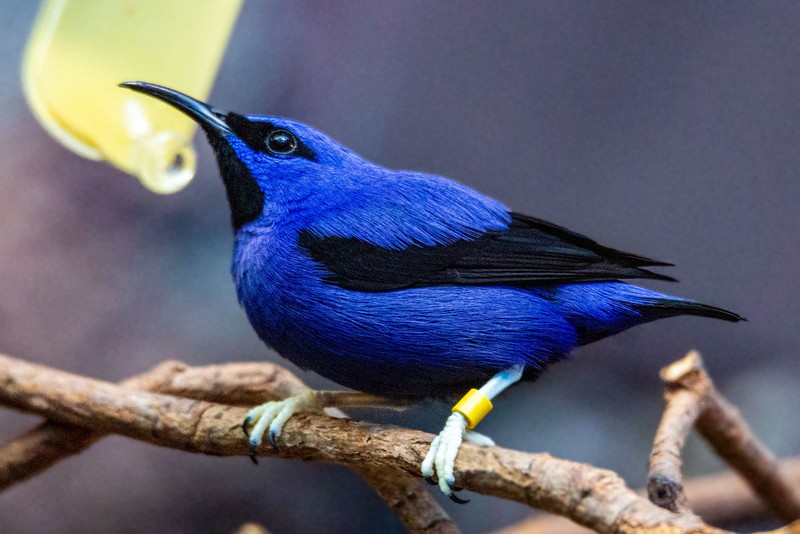Dieser etwa 10 cm große Vogel wird auch Gelbfußhonigsauger genannt, was auf seine leuchtend gelben Füße und seine Nahrung hinweist. Purpurnaschvögel ernähren sich in erster Linie von Nektar. Sie sind im nördlichen Südamerika heimisch, wo sie vor allem in Wäldern, aber auch in Plantagen und Gärten anzutreffen sind.