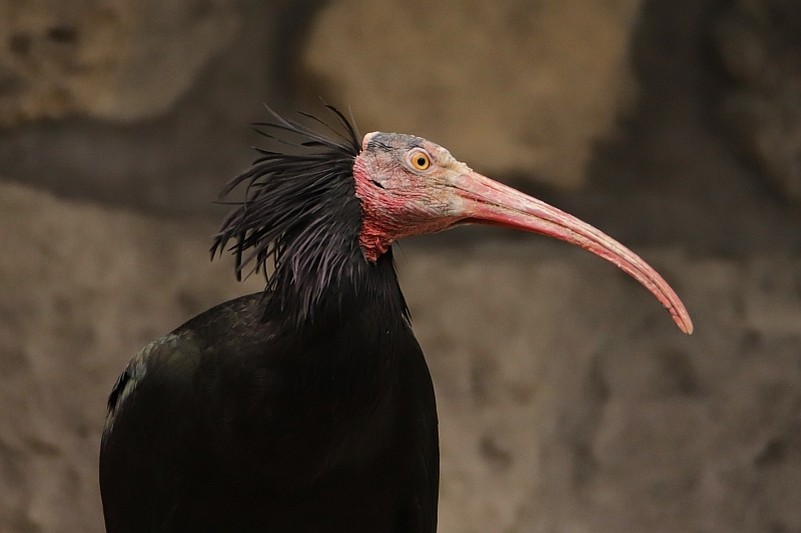 Diese extrem seltenen Ibisvögel haben ein skurriles Aussehen. Auffällig sind der unbefiederte Kopf und ihr langer, nach unten gebogener Schnabel. Dieser ist bestens dazu geeignet, Würmer und Larven aufzuspüren und sie unter Steinen, zwischen Wurzeln und aus Erdspalten hervorzustochern.